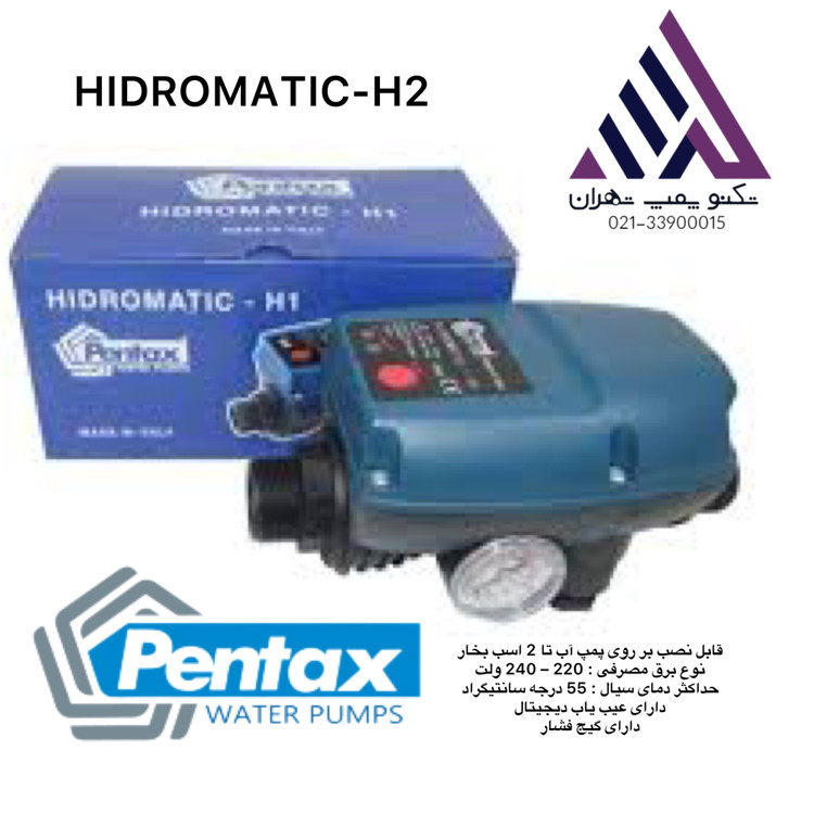 مشخصات مقدار / توضیحات مدل Pentax HIDROMATIC-H2 کشور سازنده ایتالیا کاربرد کنترل اتوماتیک پمپ آب، حفاظت خشککار توان پمپ قابل پشتیبانی تا ۲ اسب بخار (۲HP) – 12A ولتاژ ورودی 220-240 ولت / 50-60 هرتز فشار شروع قابل تنظیم از 1 تا 3.5 بار (تنظیم پیشفرض ~1.5 بار) حداکثر فشار کاری 10 بار مخزن داخلی بافر حدود 0.4 لیتر دمای مجاز آب تا 55 درجه سانتیگراد اتصالات هیدرولیکی ورودی/خروجی 1 اینچ نری درجه حفاظت IP65 (مقاوم در برابر گردوغبار و رطوبت) امکانات اضافی گیج فشار آنالوگ، برد الکترونیکی قابل تعویض