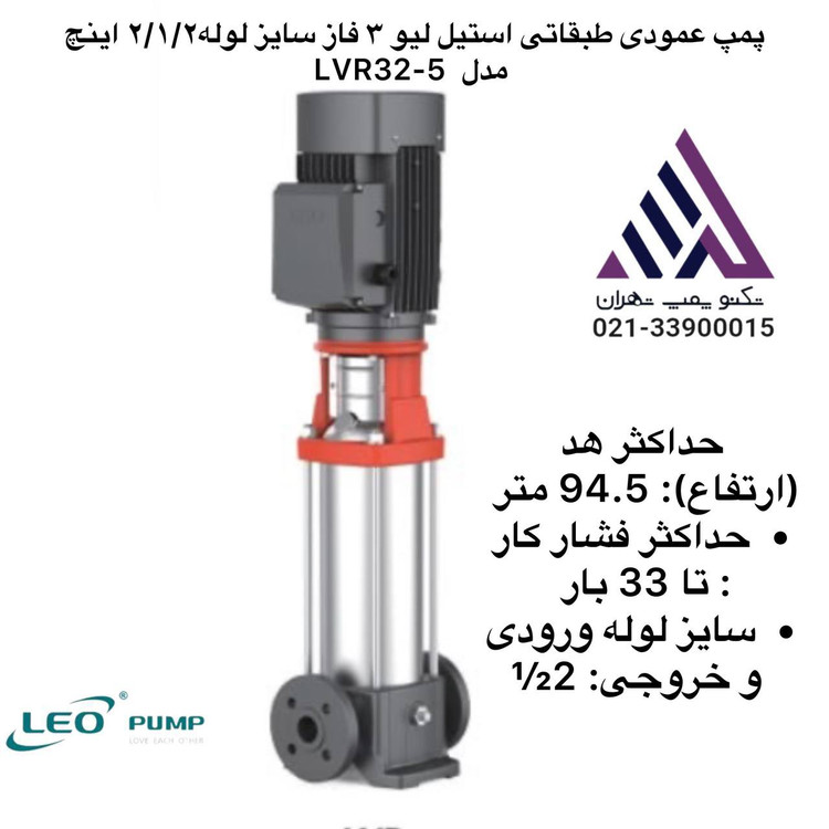 پمپ عمودی طبقاتی استیل لئو (LEO) مدل LVR32-5 یک پمپ سانتریفیوژ چندمرحلهای با طراحی عمودی است که برای کاربردهای صنعتی، آبرسانی، و سیستمهای فشار بالا طراحی شده است. این پمپ با بدنه استیل ضدزنگ 304 و عملکرد سهفاز، راندمان بالا و مقاومت در برابر خوردگی را ارائه میدهد. مدل LVR32-5 با سایز لوله 2½ اینچ برای کاربردهایی با نیاز به دبی بالا و فشار متوسط مناسب است. در ادامه مشخصات کامل این مدل بر اساس اطلاعات موجود ارائه شده است: