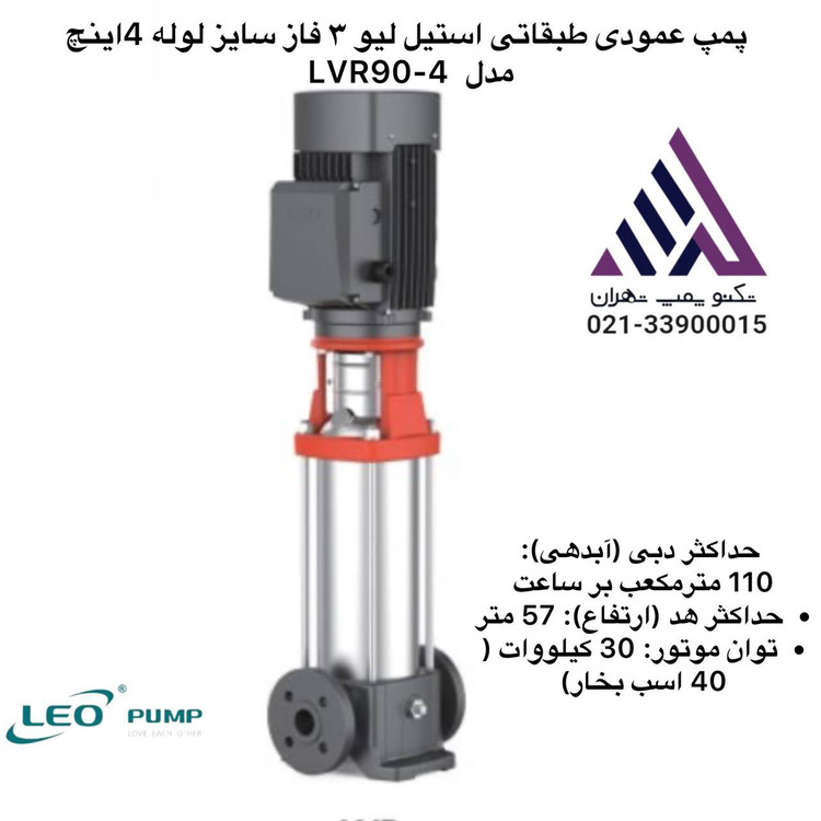 مشخصات کامل پمپ عمودی طبقاتی استیل لئو (LEO) مدل LVR90-4 با سایز لوله 4 اینچ و برق سهفاز بر اساس اطلاعات موجود از منابع معتبر و کاتالوگهای برند لئو به شرح زیر است:
