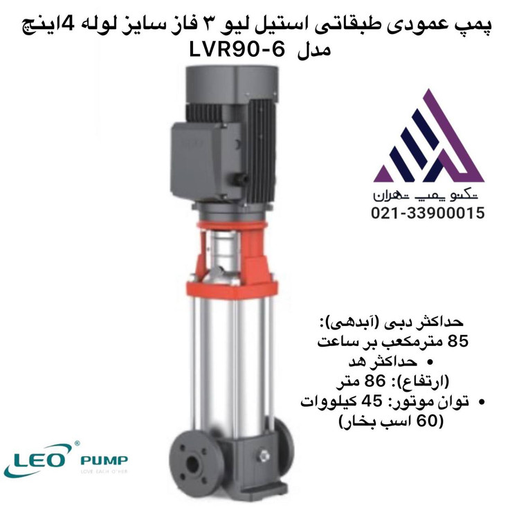 مشخصات کامل پمپ عمودی طبقاتی استیل لئو (LEO) مدل LVR90-6 با سایز لوله 4 اینچ و برق سهفاز بر اساس اطلاعات موجود از منابع معتبر و کاتالوگهای برند لئو به شرح زیر است: