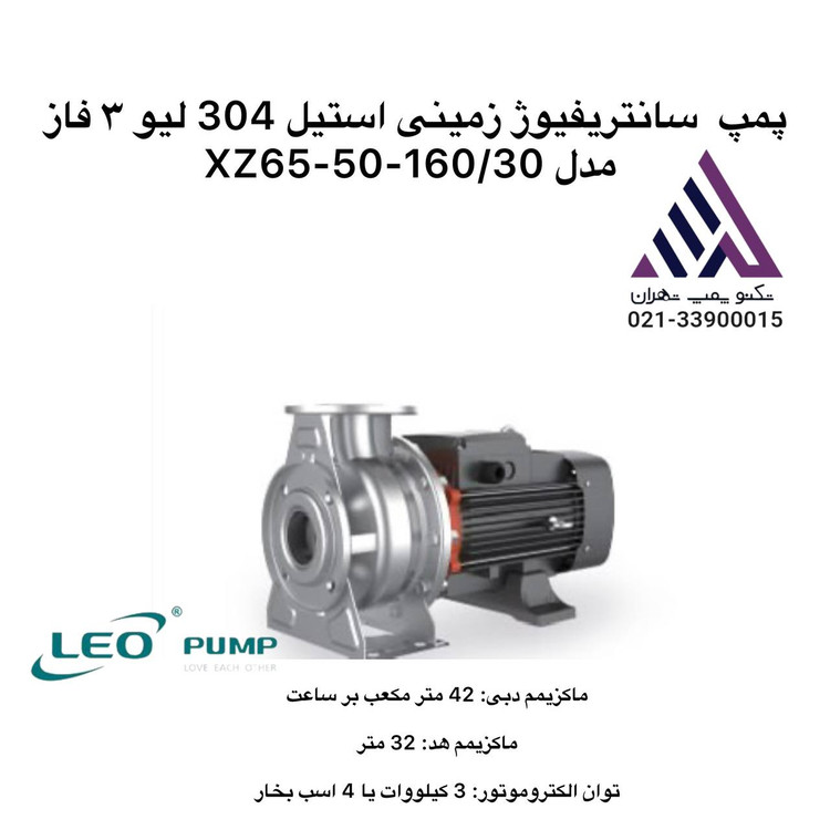 پمپ سانتریفیوژ زمینی استیل 304 لیو (LEO) مدل XZ65-50-160/30 از سری XZS شرکت لئو چین، یک پمپ صنعتی فلنجدار تمام استیل با کارایی بالا است که برای انتقال سیالات تمیز یا با خورندگی کم (مانند آب، اسید و قلیای سبک) طراحی شده است. این مدل با پروانه استیل 304 (AISI304) و موتور 30 کیلووات، مناسب کاربردهای صنعتی، آبرسانی، تصفیه آب، و صنایع شیمیایی و غذایی است. مشخصات زیر بر اساس استانداردهای اروپایی (EN733) و کاتالوگ رسمی لئو ارائه شده است.