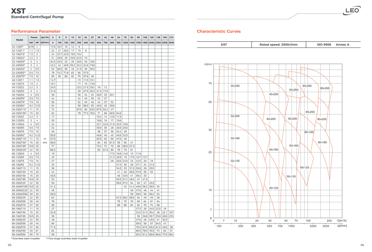 پمپ سانتریفیوژ زمینی لیو مدل XST65-125/75 یکی از محصولات پرقدرت و باکیفیت برند معتبر لیو (LEO) چین است که برای کاربردهای سنگین صنعتی، کشاورزی و ساختمانی طراحی شده است. این پمپ از نوع سانتریفیوژ تک پروانه با اتصال مستقیم (مونوبلاک) است و مطابق استاندارد EN733 تولید میشود. اگر به دنبال پمپ آب صنعتی ۳ فاز با دبی بالا و هد مناسب برای آبرسانی شهری، سیستمهای HVAC، آبیاری مزارع یا بوستر پمپ آتشنشانی هستید، مدل XST65-125/75 گزینهای ایدهآل است. در ادامه، مشخصات فنی کامل این پمپ را بر اساس کاتالوگ رسمی و دادههای فنی ارائه میکنیم.