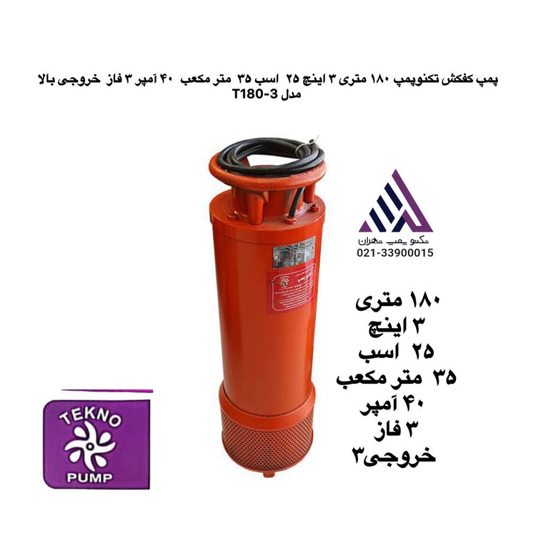 پمپ کفکش تکنوپمپ ١٨٠ متری ٣ اینچ ٢۵ اسب ٣۵ متر مکعب ۴٠ آمپر ٣ فاز خروجی بالا مدل T180-3
