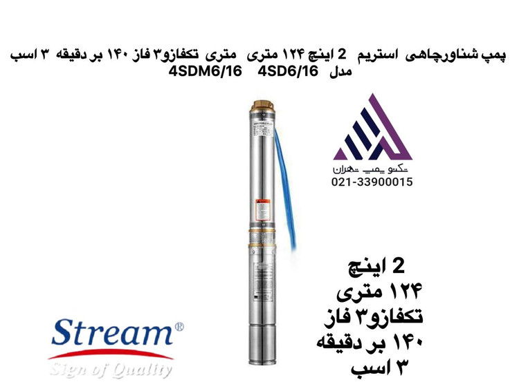 پمپ شناورچاهی استریم 2 اینچ ١٢۴ متری ١۴٠ بر دقیقه تکفاز و٣ فاز ٣ اسب مدل 4SDM6/16 4SD6/16