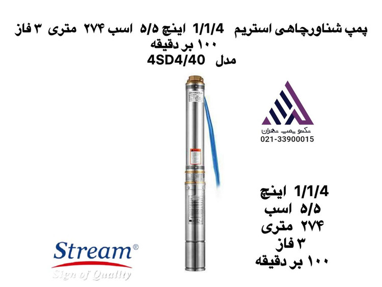 پمپ شناورچاهی استریم 1/1/4 اینچ ۵/۵ اسب ٢٧۴ متری ٣ فاز ١٠٠ بر دقیقه مدل 4SD4/40
