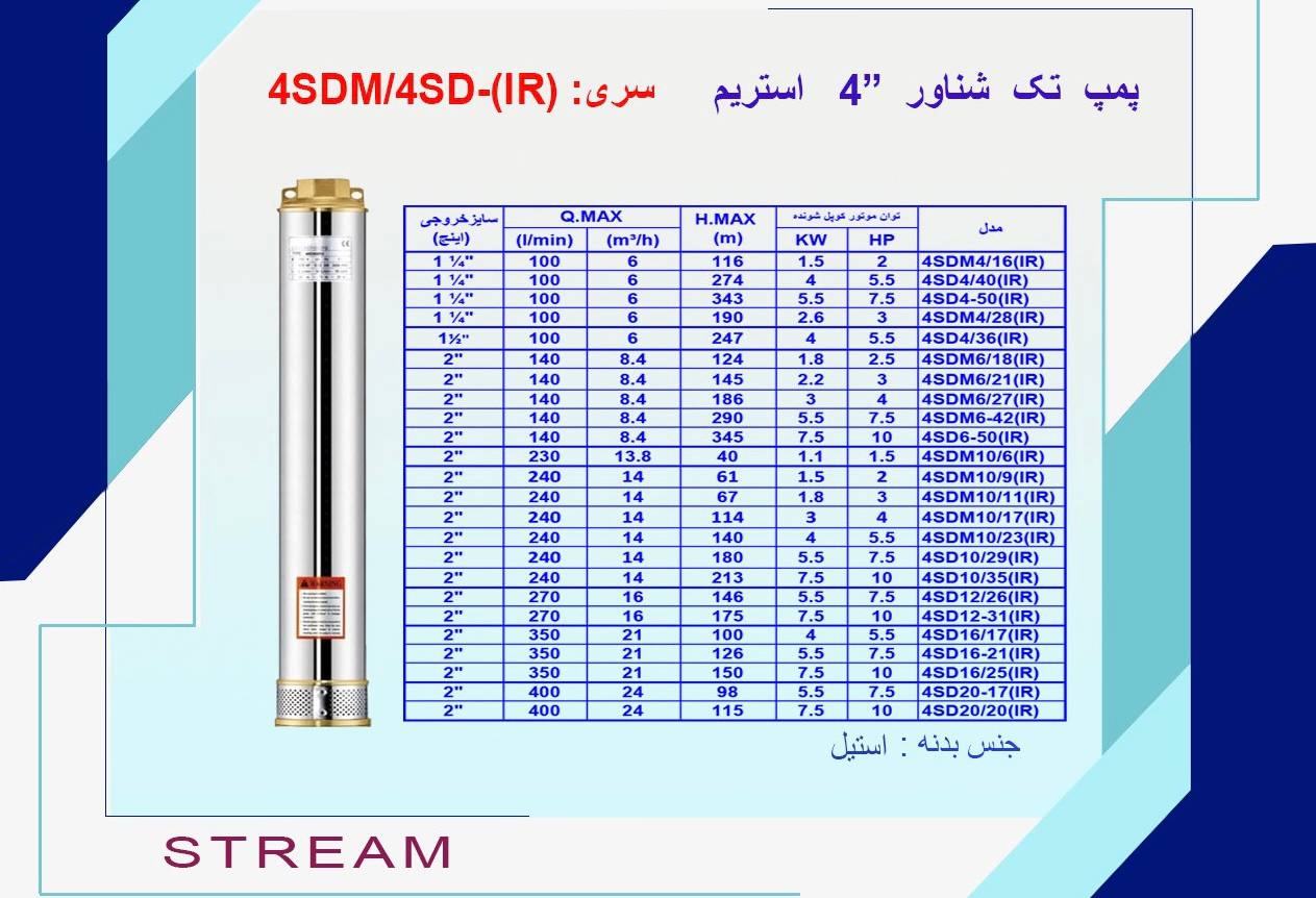 پمپ شناور استریم مدل 4SD4/40 از سری پمپهای حرفهای چاه عمیق شرکت STREAM میباشد که با طراحی چندمرحلهای و استفاده از آلیاژ استیل ضدزنگ، عملکردی قدرتمند و طولعمر بالا را در شرایط سخت کاری تضمین میکند.