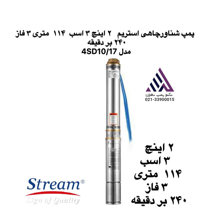 پمپ شناورچاهی استریم ٢ اینچ ٣ اسب ١١۴ متری ٣ فاز ٢۴٠ بر دقیقه مدل 4SD10/17