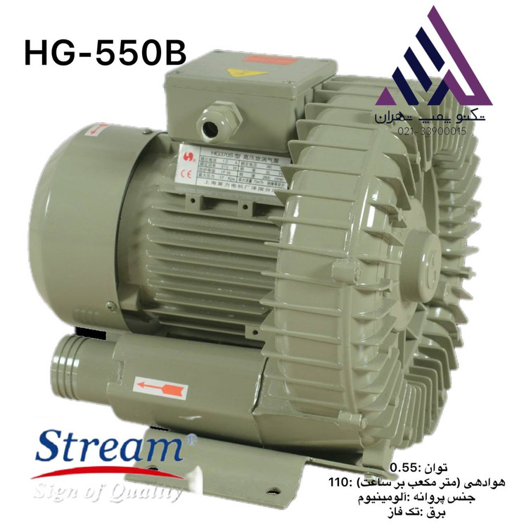 بلوئر ساید چنل استریم مدل HG-550B یکی از پرفروشترین هوادههای کممصرف و اقتصادی در بازار ایران است. این دستگاه با توان ۰٫۵ کیلووات (نیم اسب بخار) و عملکرد تکفاز ۲۲۰ ولت، برای کاربردهای سبک و متوسط مانند پرورش ماهی و میگو، سیستمهای تصفیه آب، تجهیزات صنعتی سبک و دستگاههای وکیوم طراحی شده است.