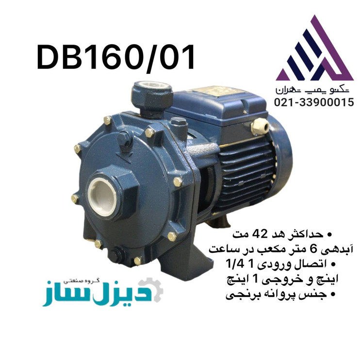 پمپ آب دیزلساز مدل DB160/01 و DBT160/01 از سری پمپهای بشقابی دو پروانه برنجی است که با توان ۱.۵ اسب بخار و ارتفاع پمپاژ ۴۲ متر، برای افزایش فشار آب در ساختمانهای چندطبقه، سیستمهای آبیاری و مصارف نیمهصنعتی طراحی شده است.