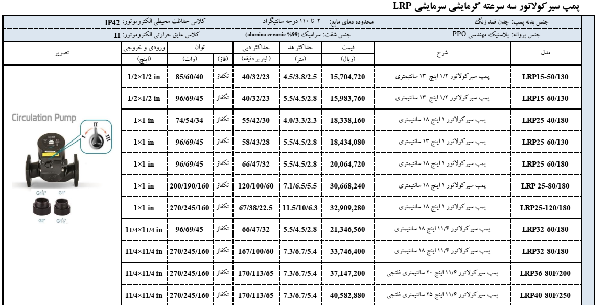 ⚙️ مشخصات فنی پمپ سیرکولاتور لیو LRP32-80/180