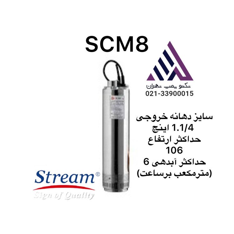 پمپ کفکش استریم (STREAM) مدل SCM8 از سری پمپهای لولهبالا (Top Outlet) است که با طراحی مستغرق و بدنه مقاوم از استنلس استیل (Stainless Steel) تولید شده و برای انتقال آب تمیز در عمق زیاد مناسب است.