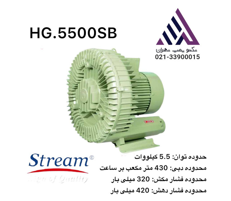 بلوئر ساید چنل استریم مدل HG-5500SB یک دستگاه قدرتمند از نوع Side Channel Blower است که با توان ۷.۵ اسب بخار (۵.۵ کیلووات) و برق سهفاز طراحی شده است.