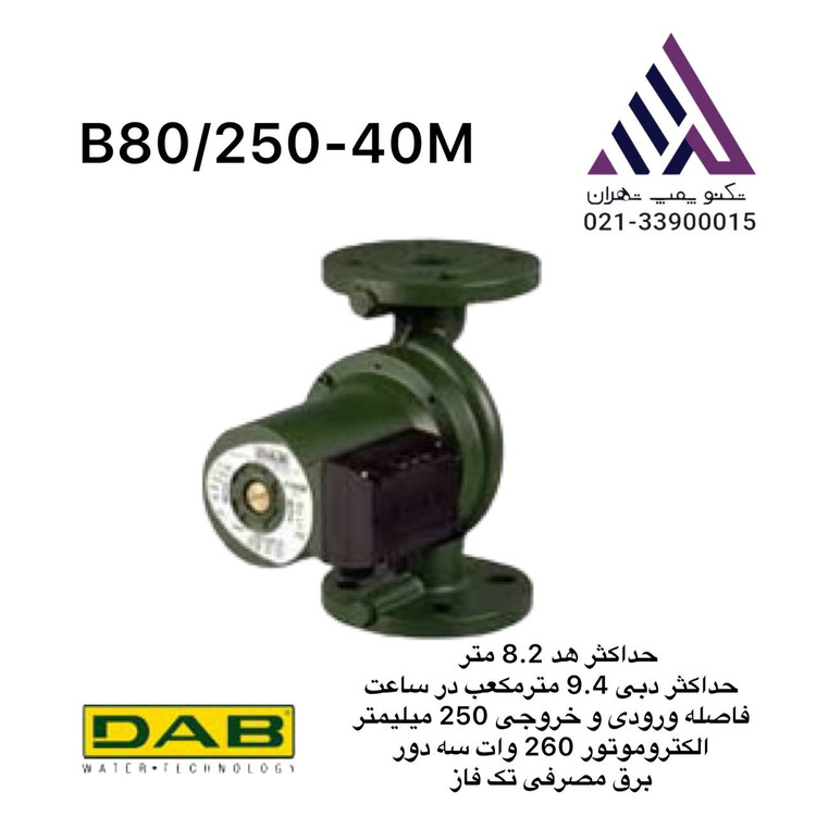 پمپ سیرکولاتور داب B 80/250-40M از نوع پمپ های خطی سیرکولاتور می باشد که سربندی برق آن به صورت تکفاز بسته می شود و در ردیف پمپ های سیرکولاتور سه دور قرار می گیرد.