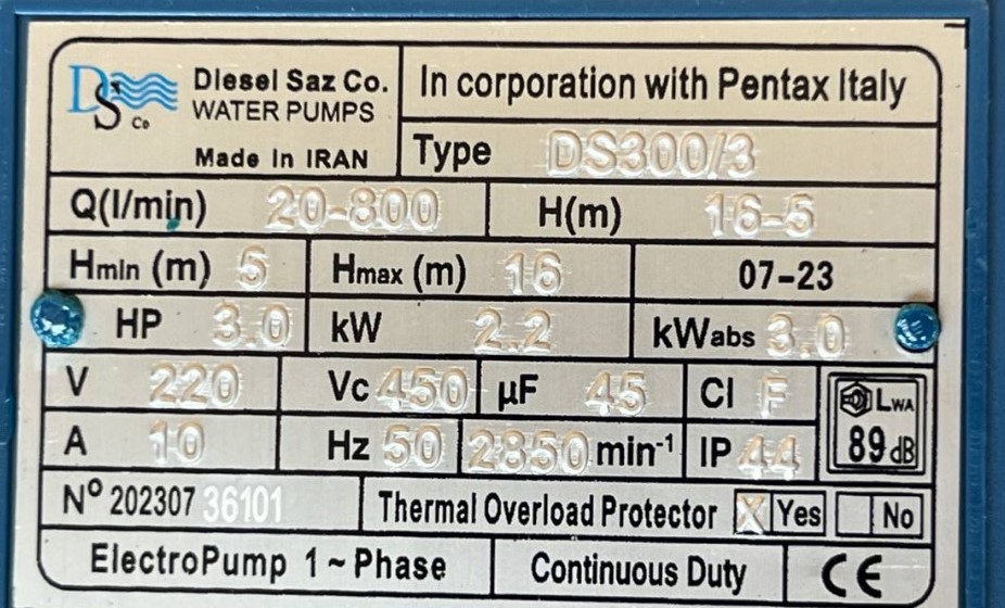 پمپ آب بشقابی 16 متری 3 اسب 3 اینچ پروانه برنجی تکفاز مدل DS300/3
