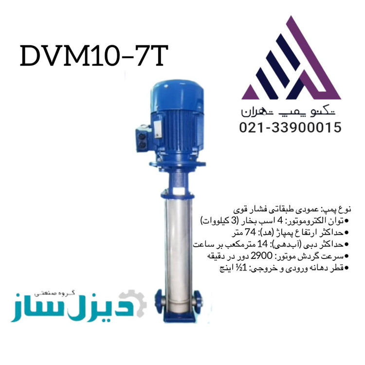 پمپ آب عمودی طبقاتی دیزلساز مدل DVM10-7T یک پمپ فشار قوی با طراحی عمودی است که برای انتقال آب در کاربردهای صنعتی و ساختمانی مورد استفاده قرار میگیرد. در ادامه، مشخصات فنی این پمپ آورده شده است