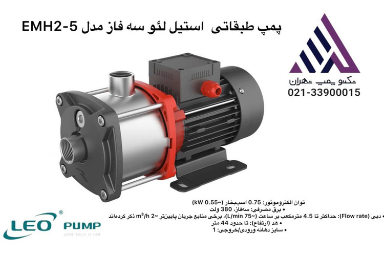 پمپ طبقاتی افقی استیل لئو سه فاز 44 متری 55% کیلولت 4/5 متر مکعب مدل EMH2-5