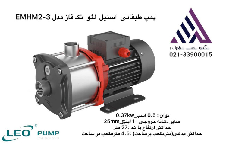 پمپ طبقاتی افقی استیل لئو مدل EMHM2-3 یکی از پمپهای کممصرف و با راندمان بالا از سری EMHM برند LEO است که برای افزایش فشار آب در مصارف خانگی، اداری و صنعتی سبک طراحی شده است.